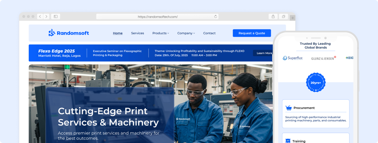 Existing for over 20years, the Randomsoft brand was established to deliver print technology solutions and services for businesses and enterprise organizations. At the time, it was focused on the print production and its current brand position couldn’t take it further in alignment with the founder’s visions - to become the bridge for African industries to compete with global standard by providing access to cutting-edge machinery, support and technical services.
